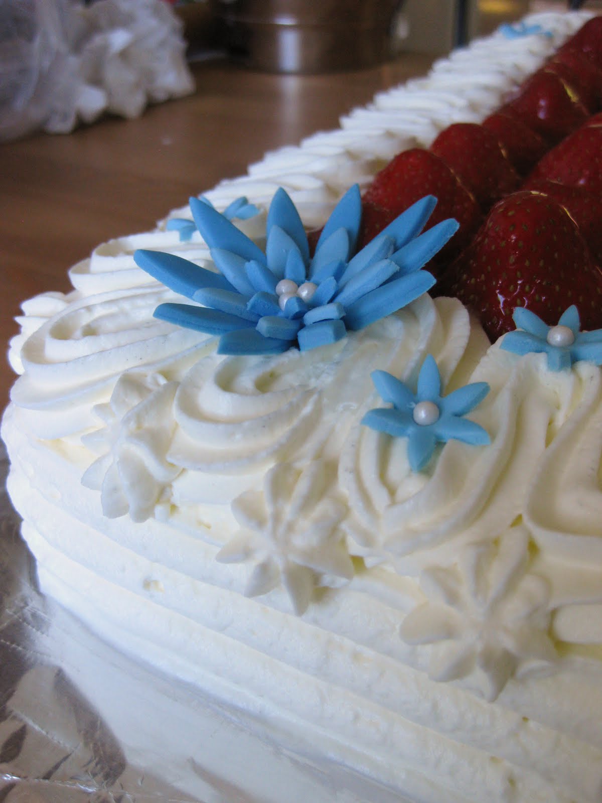 Tämä oli ensimmäinen mansikkakermakakkuni sitten koulun jälkeen, mukavaa vaihtelua pitkästä aikaa! Olin jo vähän ehtinyt tämän tekemistä kaipaillakin. Sisällä mansikanpaloja ja mansikkamousse, todella mansikkaisen raikas kakku siis kyseessä! Päällä kermavaahtoa, mansikoita ja kuumahyytelöä. Kukat on valmistettu sokerimassasta ja koristekuulista.