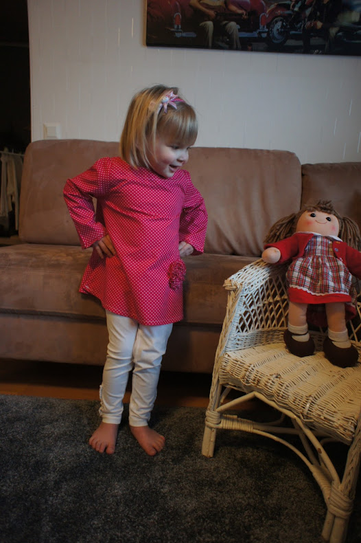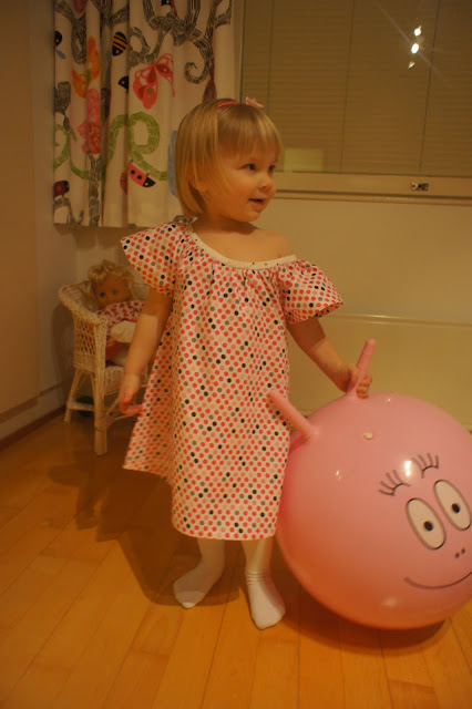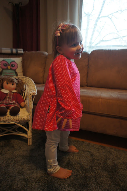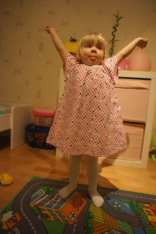 Ja sitten taas Alviina menee paremmin tunikasta. Pääntiekin on sopivamman kokoinen. Alviinan kangas on Eurokankaan puuvillapopliinia.