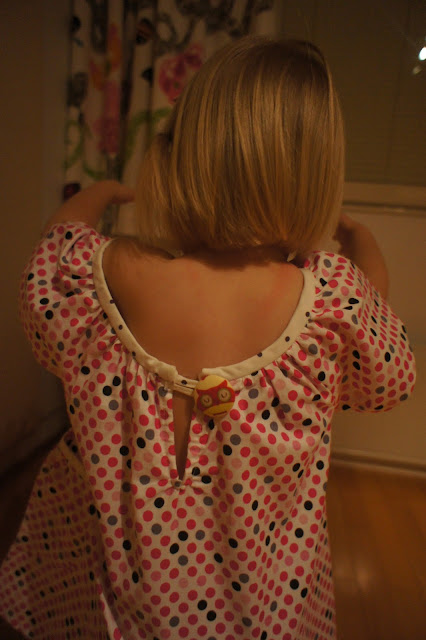 Orelma oli mitoitukseltaan sen verran reilu, varsinkin tuon pääntien kohdalta, että menee käytössä varmasti pitkään... Olisin kuronut pääntietä kapeammaksi, jos olisin päässyt sovittamaan tätä Viivin päälle jo ompeluvaiheessa, mutta valmiin mekon purkaminen tuntui turhan työläältä. Tämä kangas löytyi Eurokankaan palalaarista hävyttömän halpaan hintaan, pääntien huolittelukaitale omista varastoista.